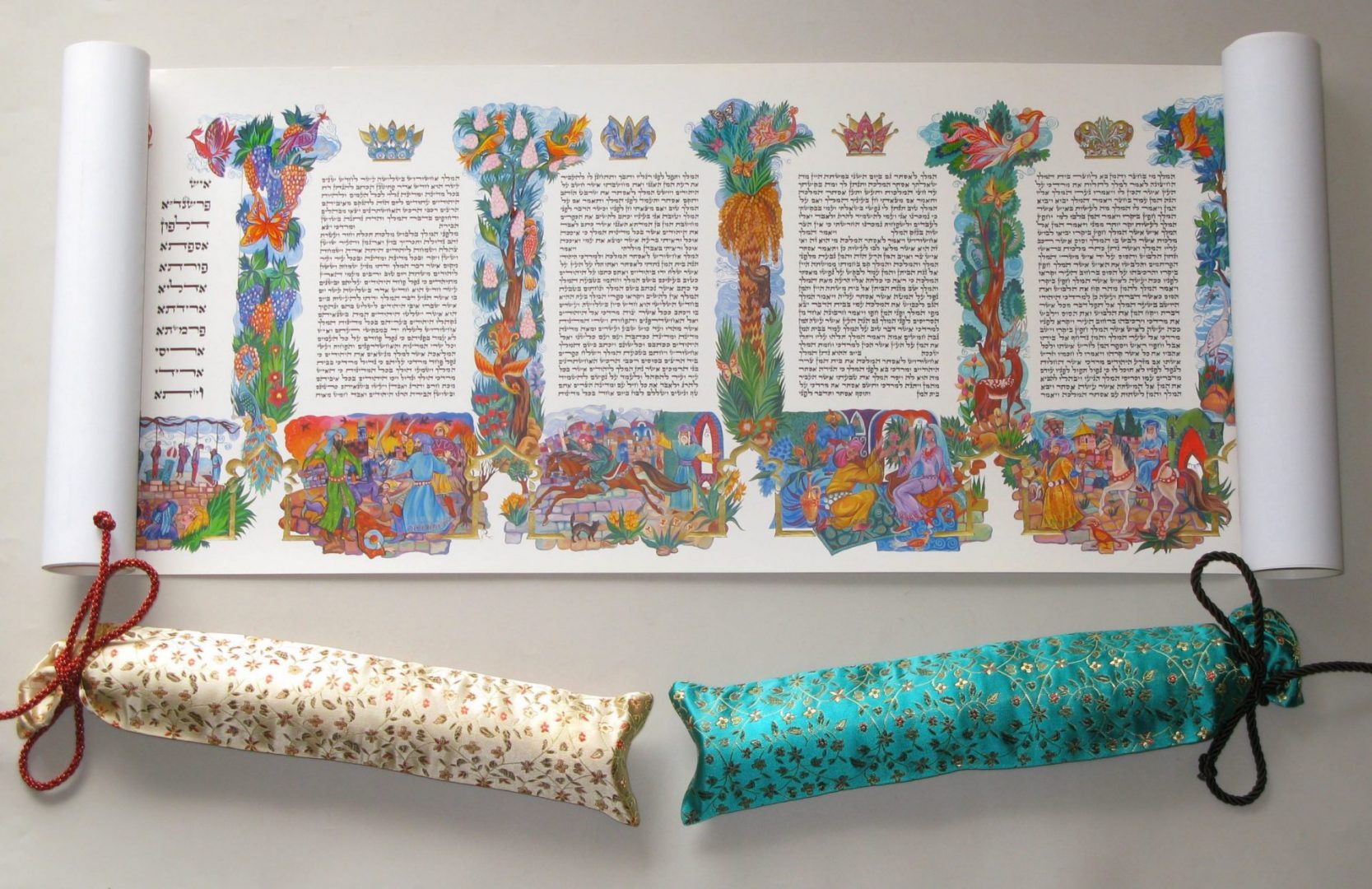 ₪659.00חוגגים את חג הפורים וקוראים את המגילה ברוב פאר והדר!מגילת אסתר מודפסת במהדורה מוגבלת – 900 עותקים ממוספרים – בנרתיק בד מפואר. את הקליגרפיה המעוטרת של סופר הסת”ם אברהם בורשבסקי איירה אירה גולוב ב-2003, ולפי המנהג, גם מגילה זו מחולקת לעמודות שמרביתן פותחות במילה “המלך”. מעל כל עמודה איור של כתר אחר, ומתחתיה – המאורע המתואר בה.