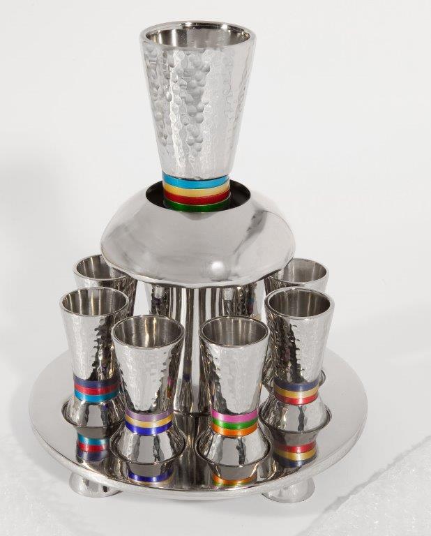 גביע קידוש מעוצב בעבודת פטיש וטבעות מקיפות בתחתית בצבעי אנודייז.