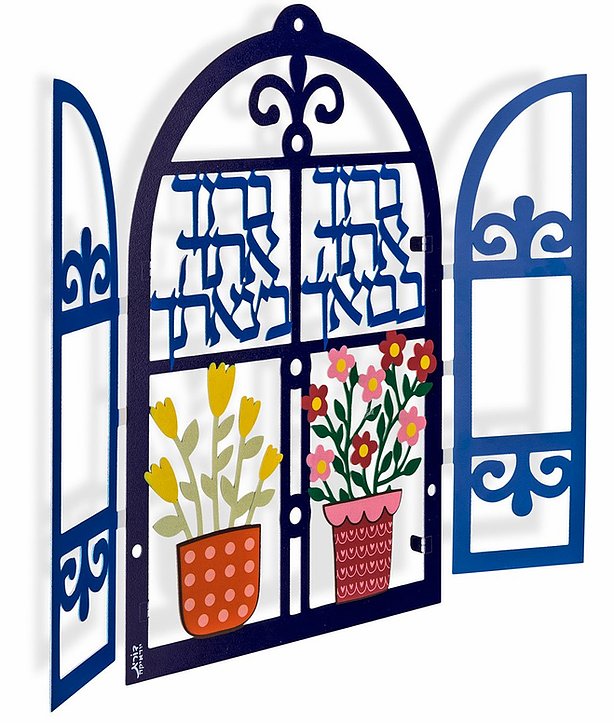 תכשיט קיר - פריט קישוט ייחודי - דבוקת אותיות במגזרת נירוסטה הפריט מעוצב לתליה ב"ריחוף" מהקיר היוצרת נוכחות מרשימה וצללית של האותיות על הקיר בהתאם לתאורה. מסגרת ייחודית בצורת חלון וינטג' צבעוני עם ברכות, אדנית פרחים וזוג יונים,