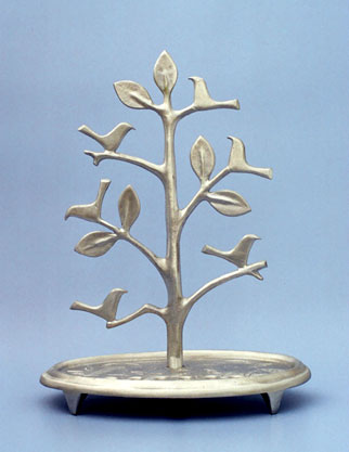 חנוכיה זו בנויה מיציקת פליז כעץ החיים . על העץ עלים וציפורים וברצפת החנוכיה חרוטים עלים יפיפיים.