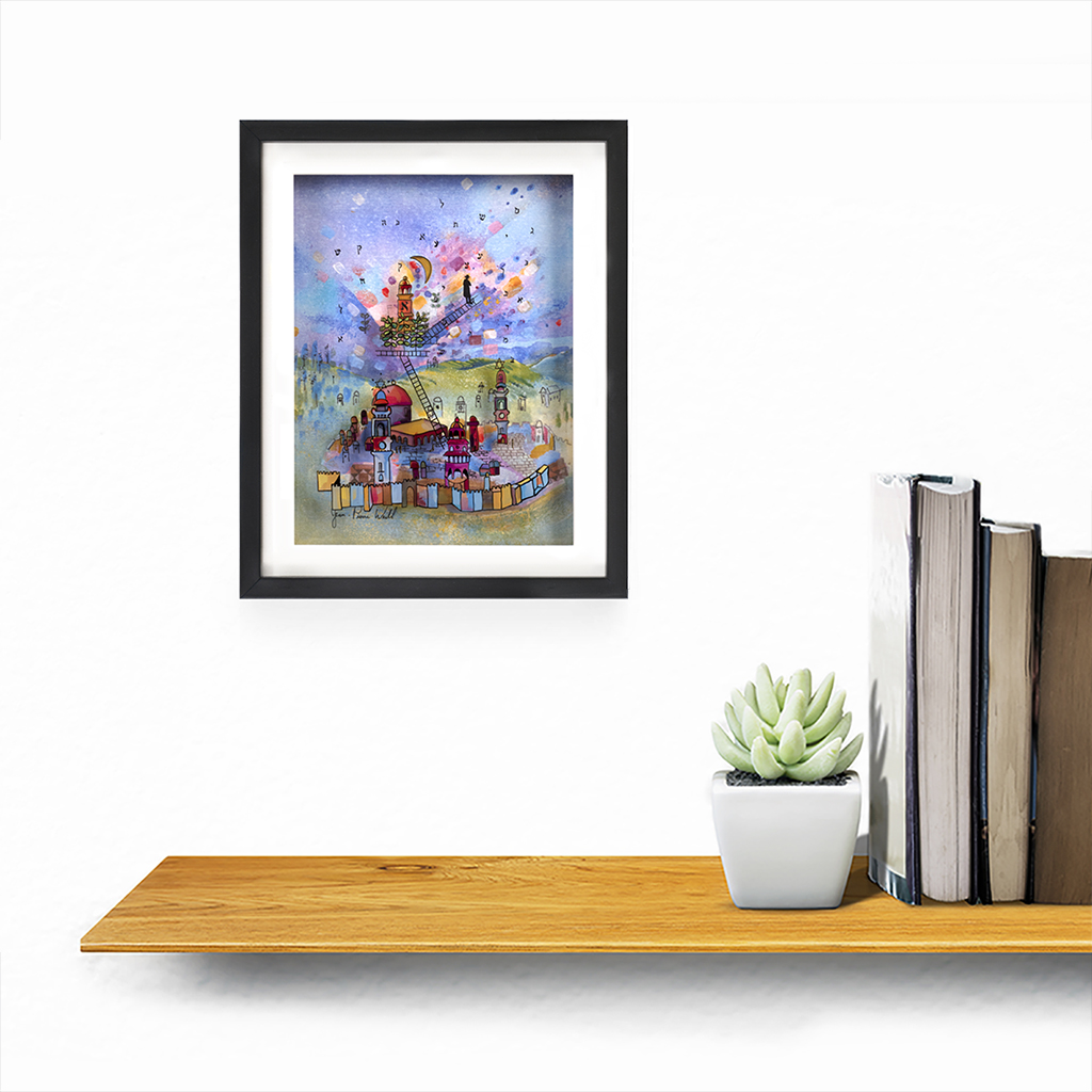 חלון מסמל את הקיץ הישראלי. צהוב השמש, חופש, חוף ים , ציפורים אבטיח ומים . לתליה על הקיר או להניח על מדף.