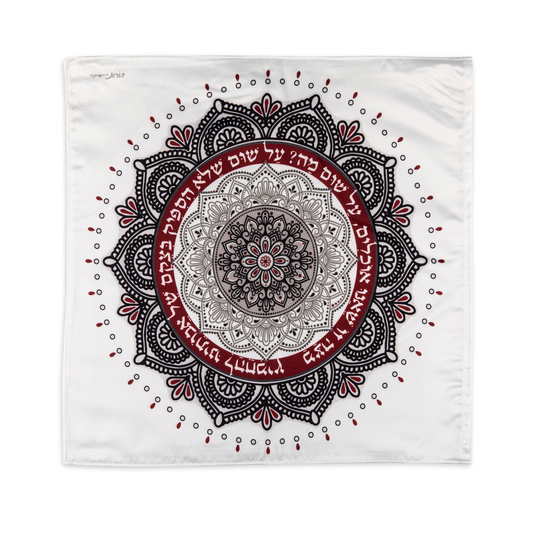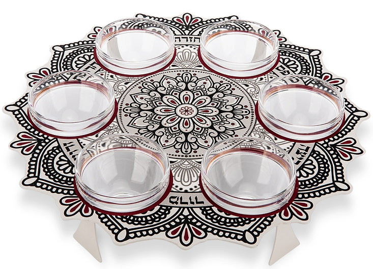 צלחת הסדר כוללת 6 צלוחיות זכוכית. סימני החג השונים מופיעים בשמותיהם על גבי הצלחת .