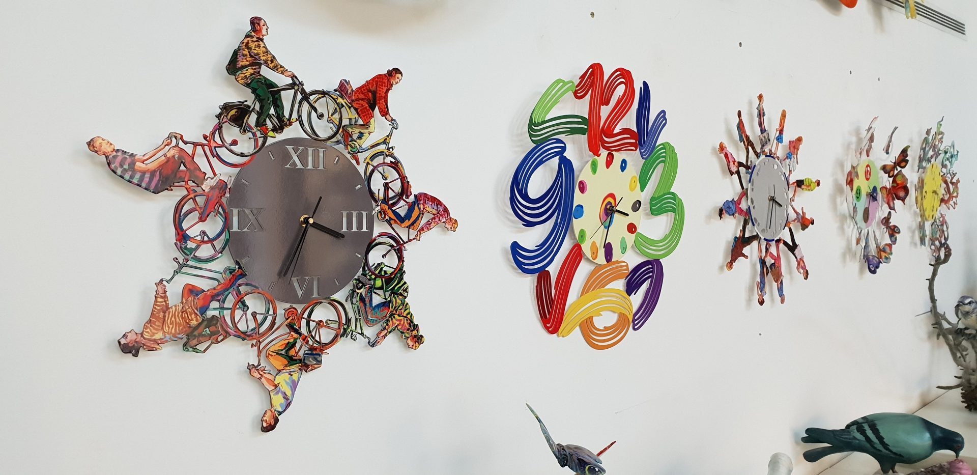 בכל רגע יש אי שם בעולם וכאן רוכבים על אופניים. שעון אמנותי זה מייצג יבשות ועונות שנה ומייצג עולם ססגוני.